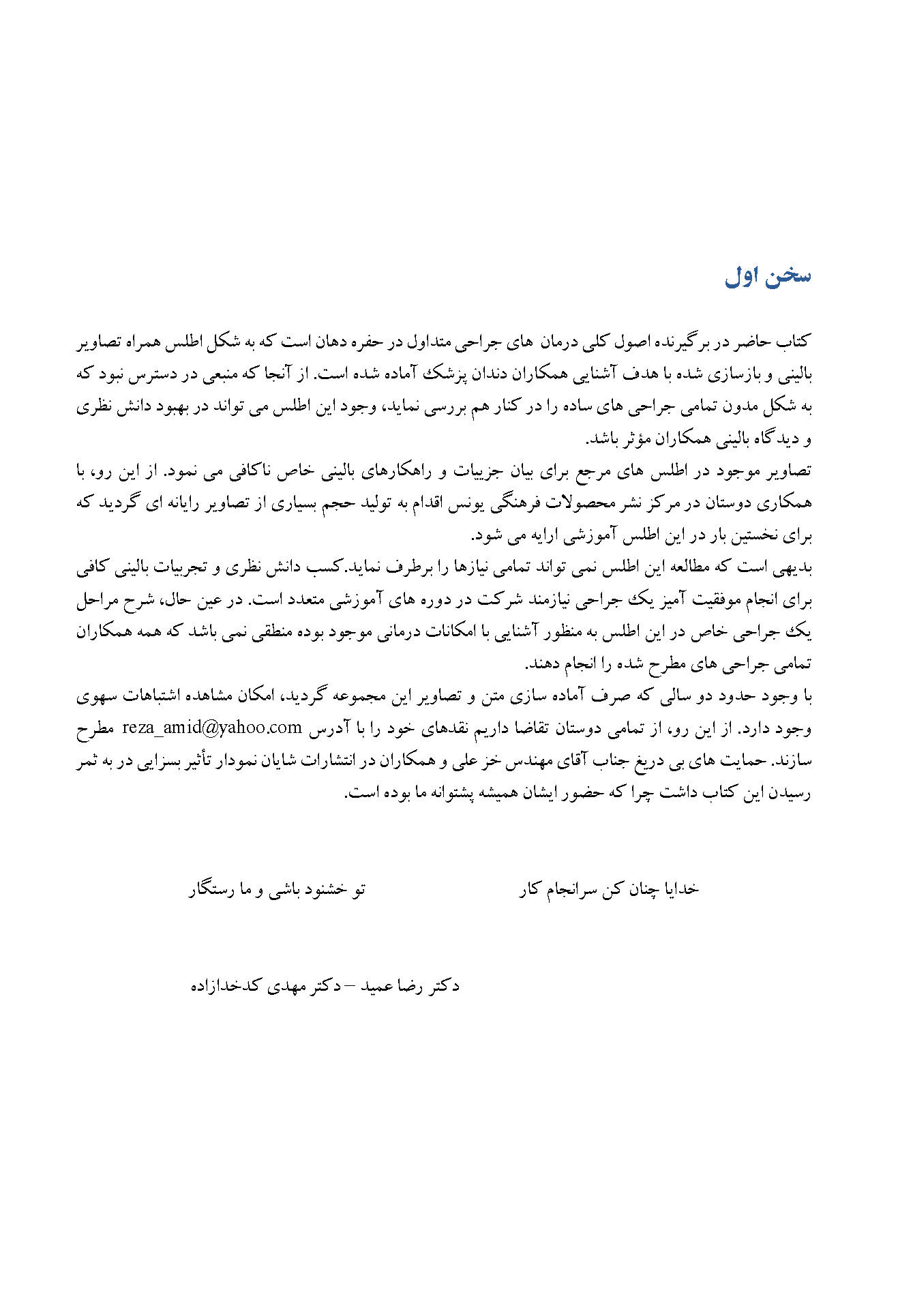 بدیهی است که مطالعه این اطلس بهتنهایی نمیتواند تمامی نیازهای علمی و عملی را برآورده سازد. کسب دانش نظری و تجربیات بالینی لازم برای انجام موفقیتآمیز جراحی، مستلزم شرکت در دورههای آموزشی متعدد است. همچنین، شرح مراحل یک جراحی خاص در این اطلس تنها با هدف آشنایی با امکانات درمانی موجود صورت گرفته و منطقی نیست انتظار داشته باشیم همه همکاران تمامی جراحیهای مطرحشده را انجام دهند.
