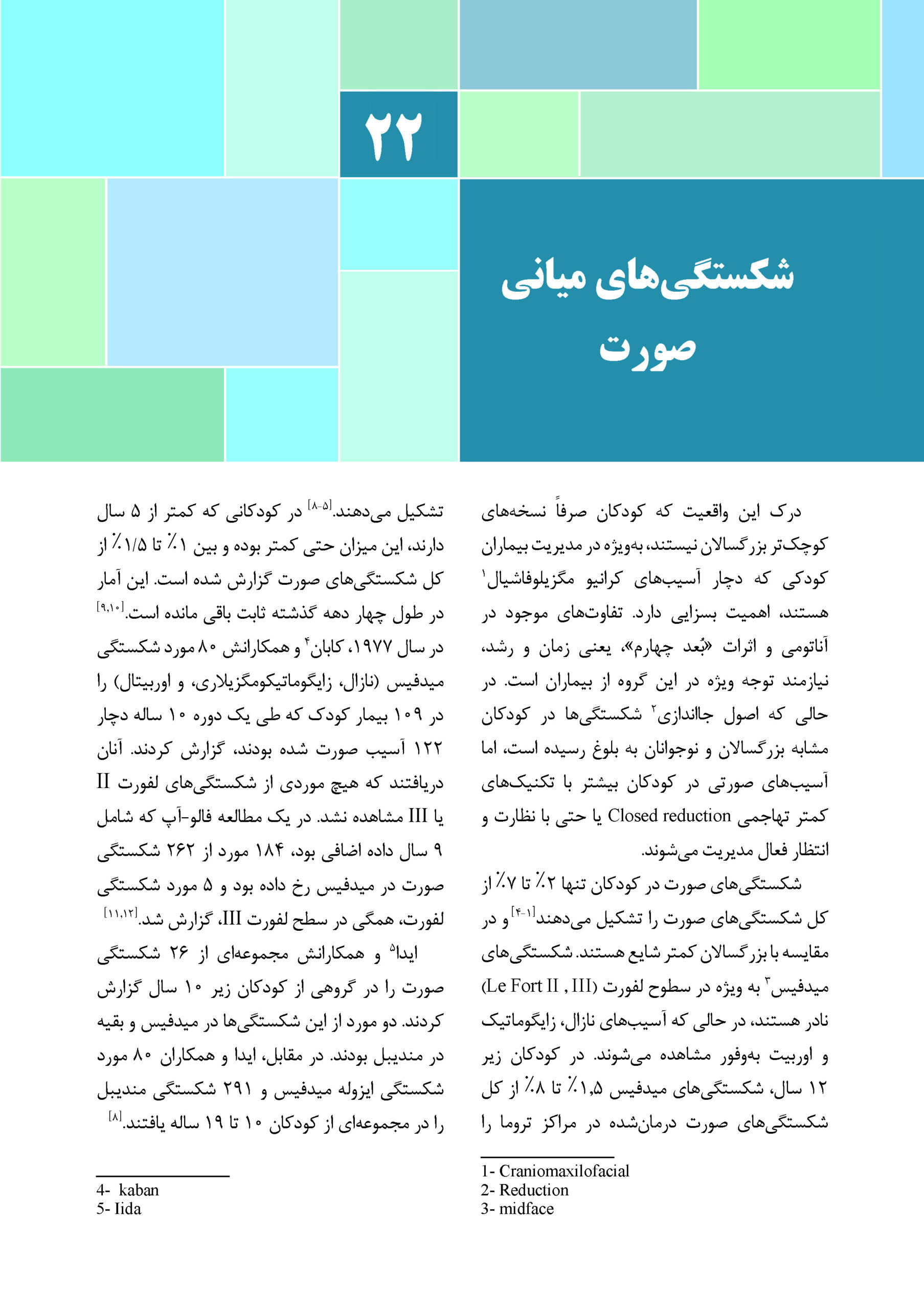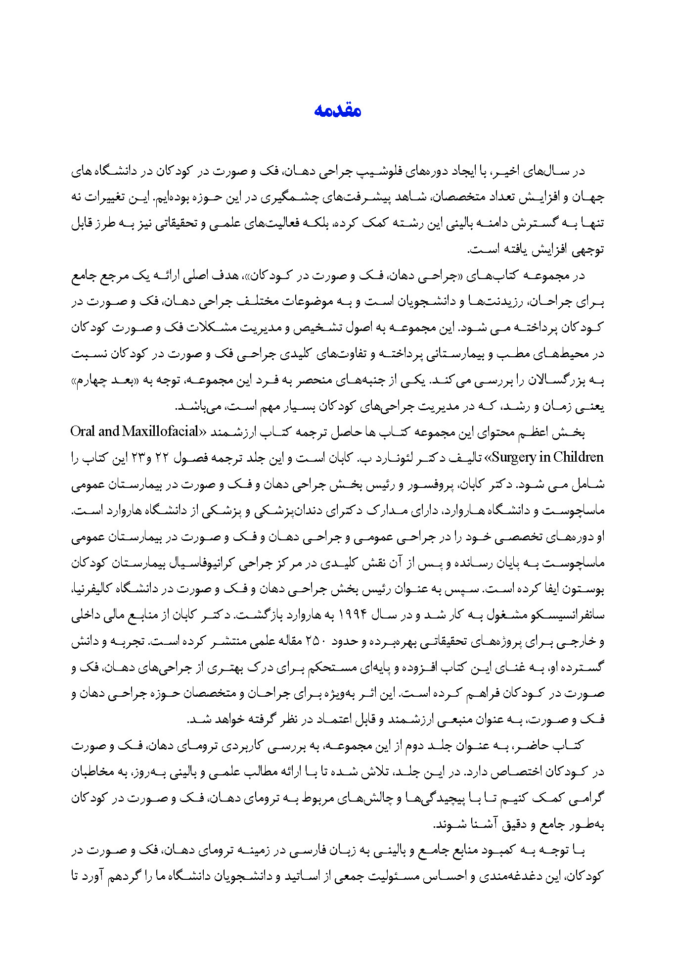 بخش اعظم محتوای این مجموعه کتاب‌ها حاصل ترجمه‌ی کتاب ارزشمند Oral and Maxillofacial Surgery in Children تألیف دکتر لئونارد ب. کابان است و این جلد ترجمه‌ی فصول 22 و 23 این کتاب را شامل می‌شود. دکتر کابان، پروفسور و رئیس بخش جراحی دهان و فک و صورت در بیمارستان عمومی ماساچوست و دانشگاه هاروارد، دارای مدارک دکترای دندان‌پزشکی و پزشکی از دانشگاه هاروارد است.