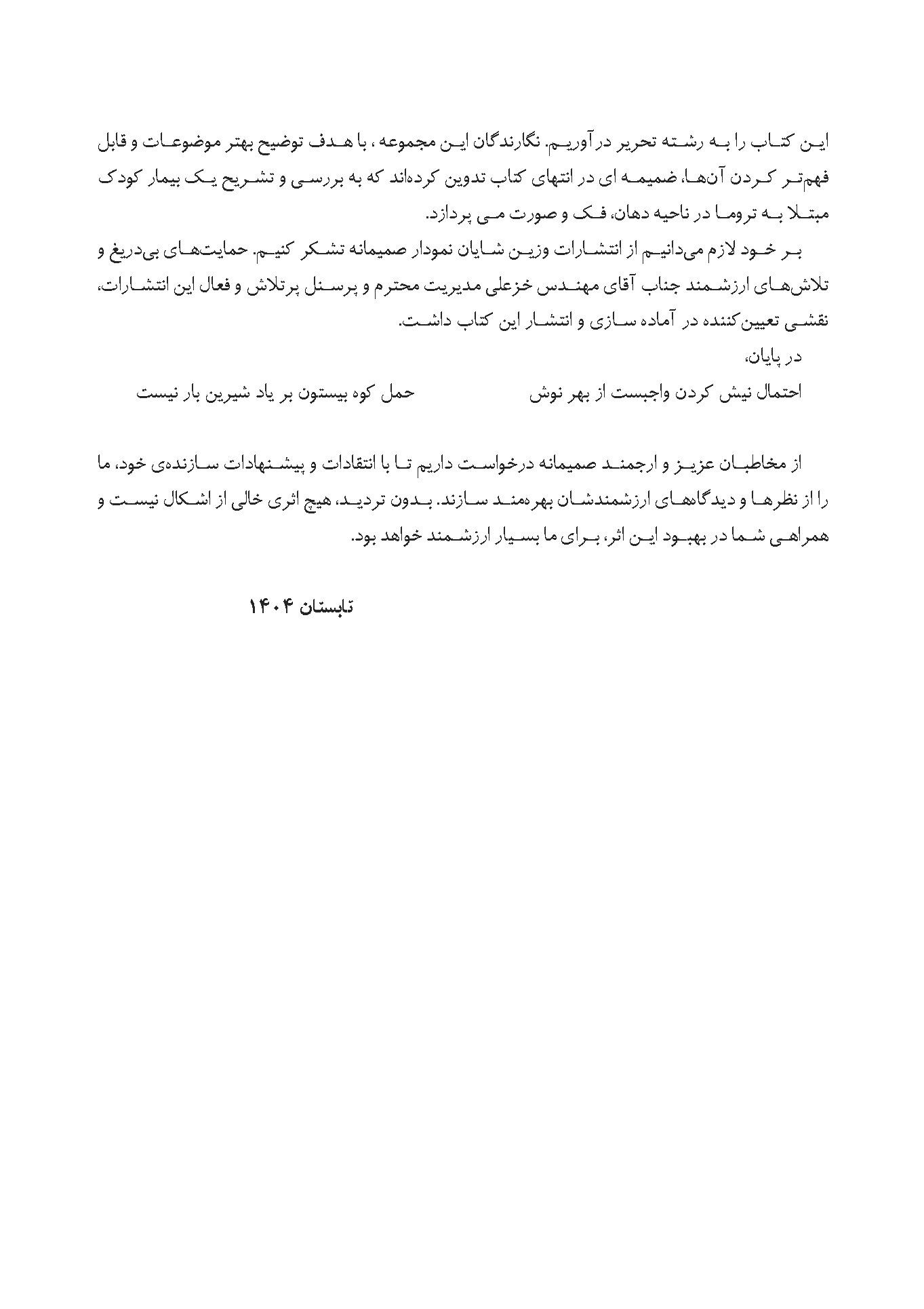 بر خود لازم می‌دانیم از انتشارات وزین شایان نمودار صمیمانه تشکر کنیم. حمایت‌های بی‌دریغ و تلاش‌های ارزشمند جناب آقای مهندس خزعلی، مدیریت محترم و پرسنل پرتلاش و فعال این انتشارات، نقشی تعیین‌کننده در آماده‌سازی و انتشار این کتاب داشته است.