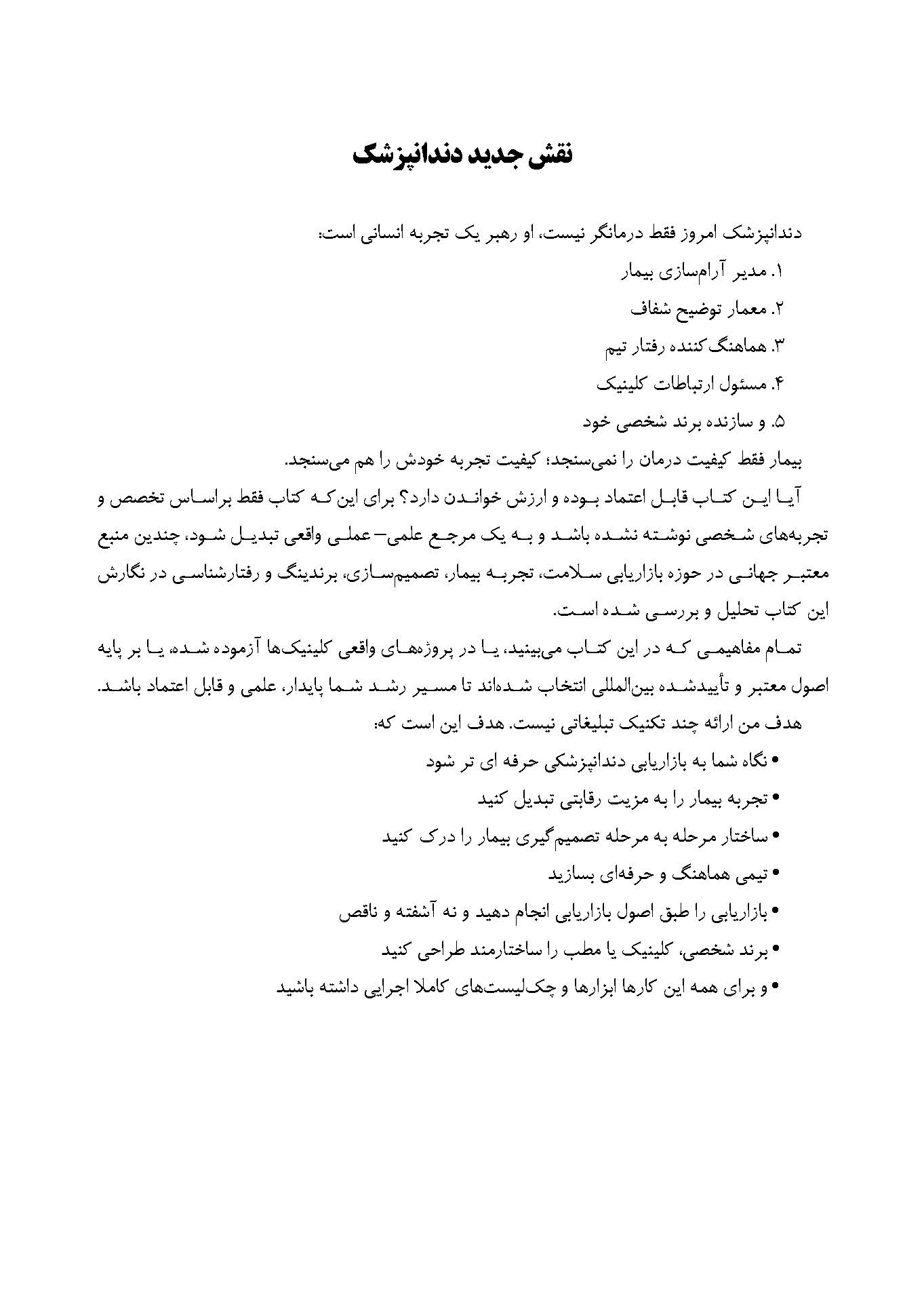 بنابراین بازاریابی و برندسازی که در کتاب دنتومارکتینگ میخوانید، از تبلیغات شروع نمیشود؛ بلکه از سرچشمه اصلی، یعنی از درون کلینیک و مطب شروع میشود.