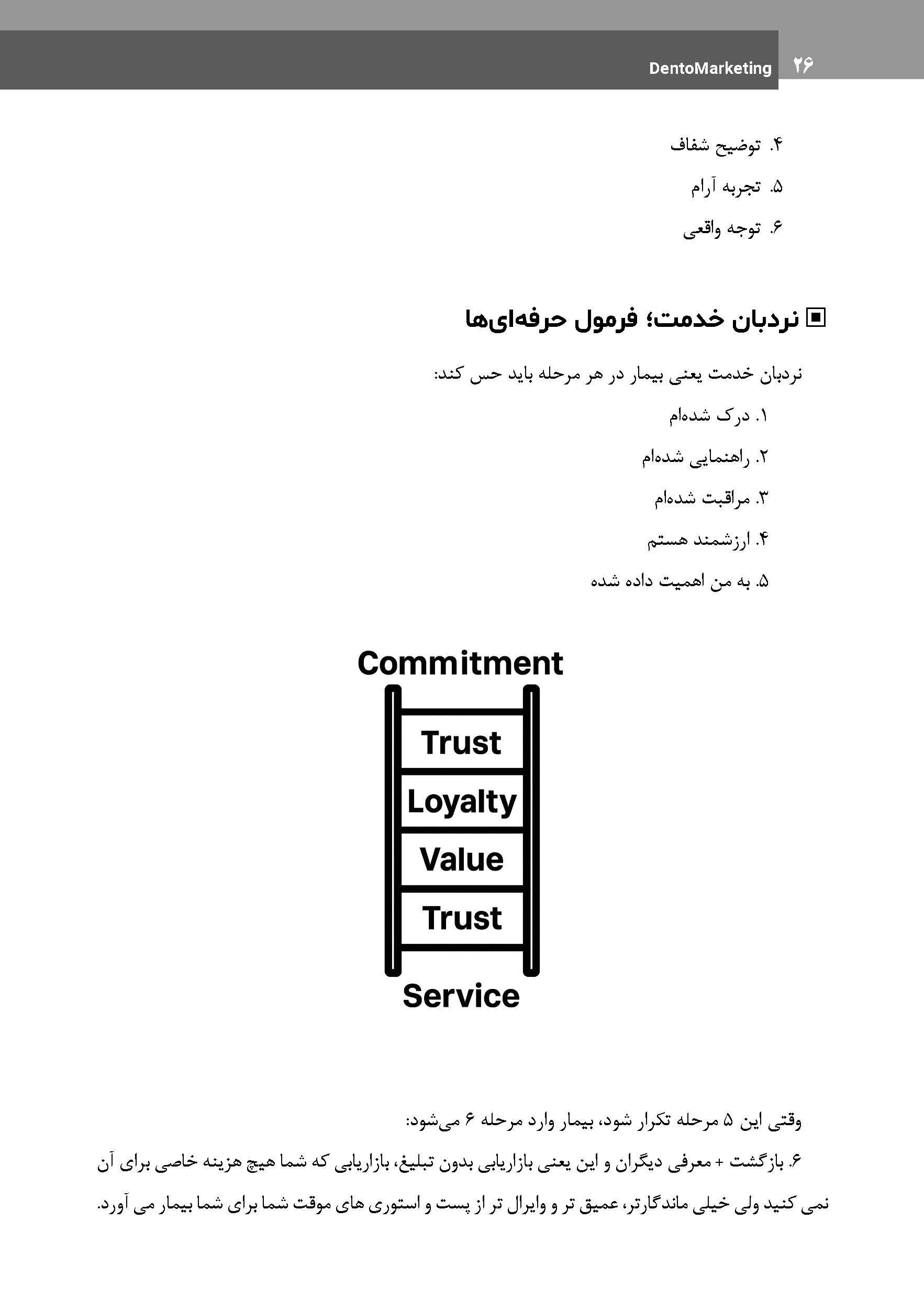 در کتاب دنتومارکتینگ، بازاریابی یعنی بیمار در هر مرحله از مسیر درمان احساس امنیت، احترام و شفافیت داشته باشد و با تجربهای مثبت خارج شود.
