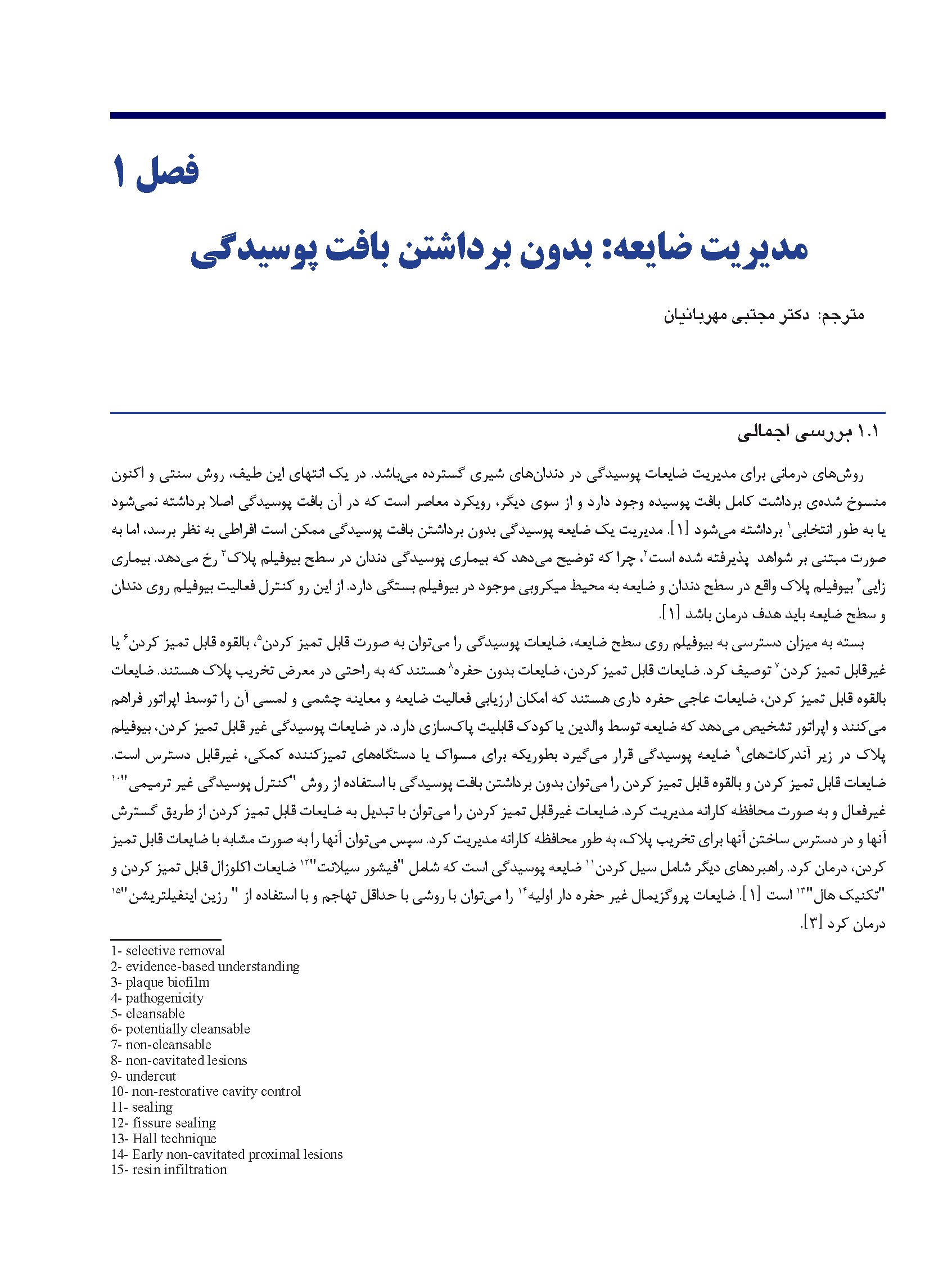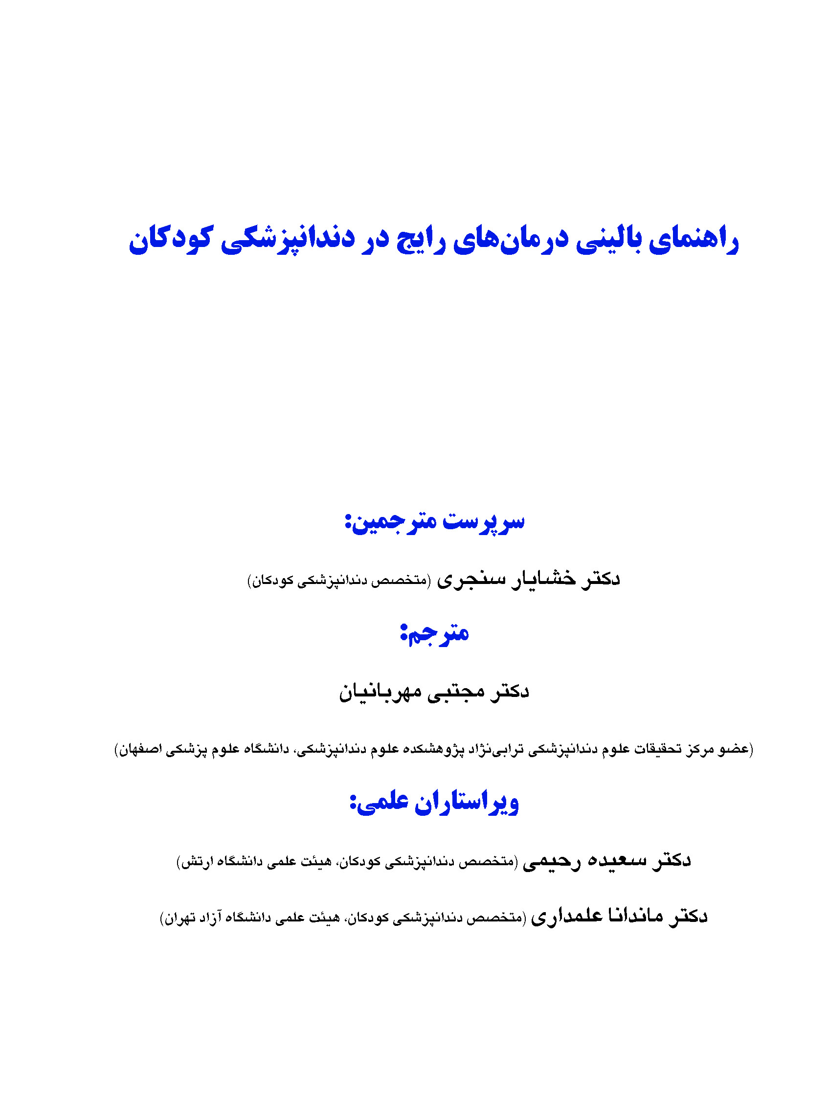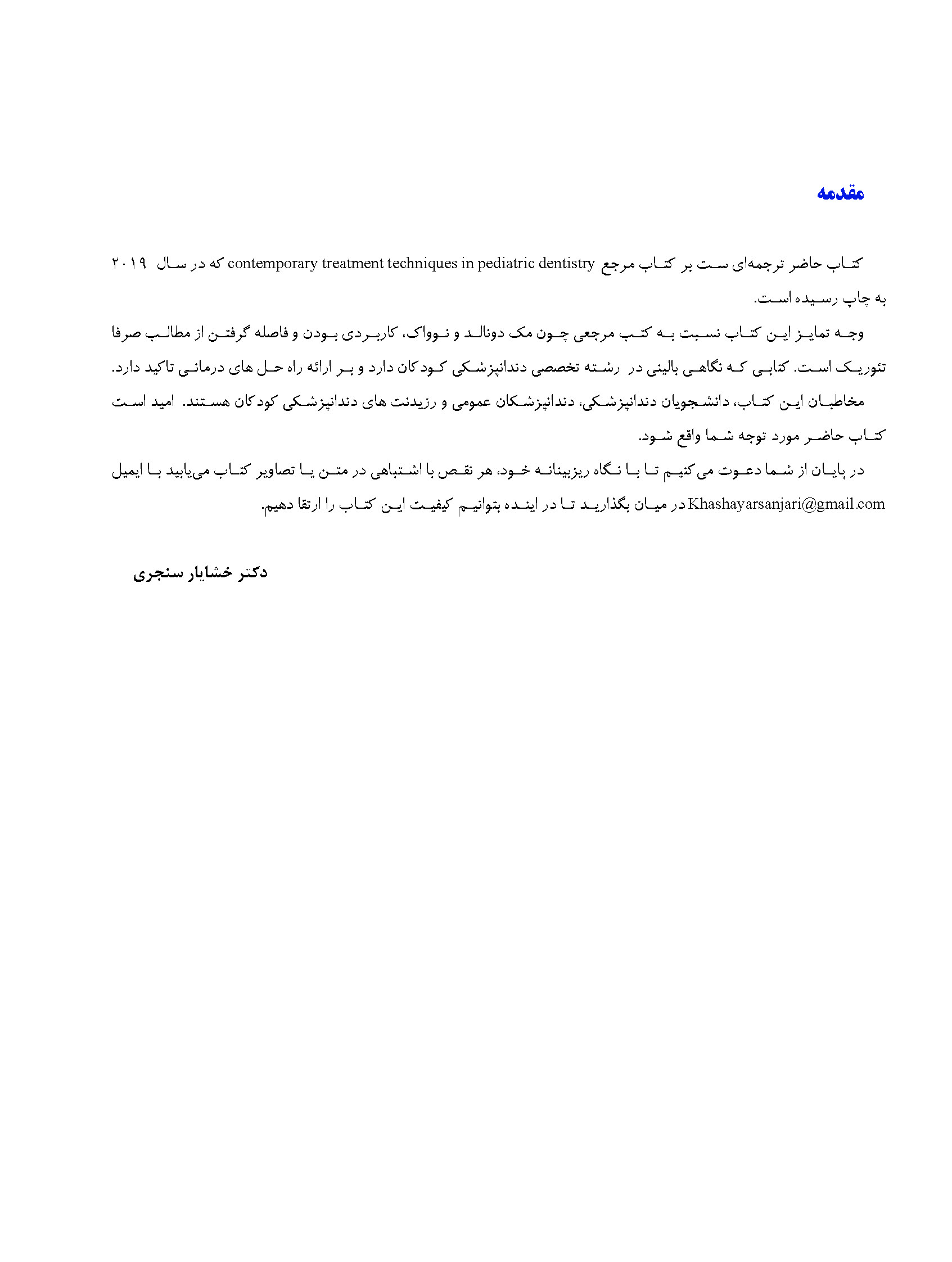 کتاب حاضر ترجمه‌ای است از کتاب مرجع «Contemporary Treatment Techniques in Pediatric Dentistry» که در سال ۲۰۱۹ به چاپ رسیده است. وجه تمایز این منبع نسبت به کتاب‌های مرجعی چون مک‌دونالد و نوواک، رویکرد کاربردی و فاصله گرفتن از مطالب صرفاً تئوریک است؛ کتابی با نگاهی بالینی در رشته تخصصی دندان‌پزشکی کودکان که بر ارائه راه‌حل‌های درمانی تأکید دارد.
