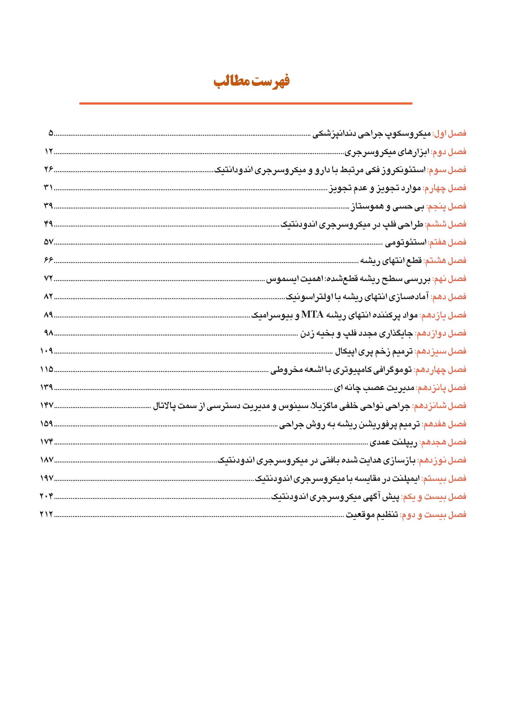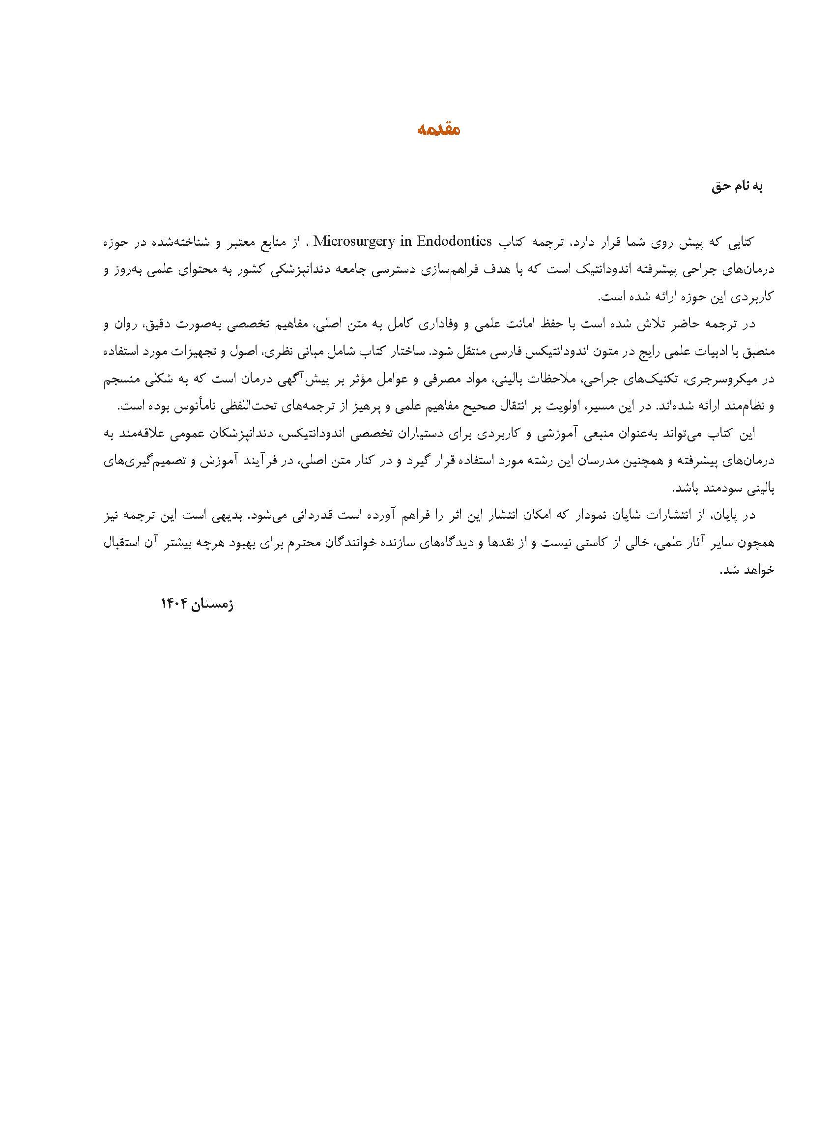 کتابی که پیشِ روی شما قرار دارد، ترجمه کتاب Microsurgery in Endodontics است؛ اثری معتبر و شناختهشده در حوزه درمانهای جراحی پیشرفته اندودانتیک که با هدف فراهمسازی دسترسی جامعه دندانپزشکی کشور به محتوای علمی روزآمد و کاربردی این حوزه ارائه شده است.
