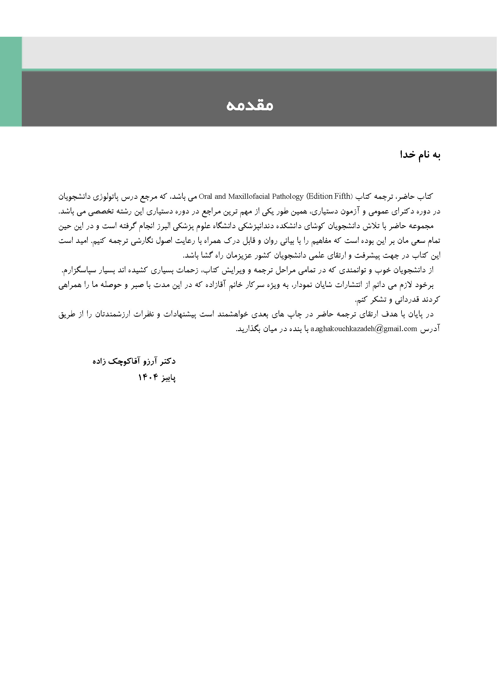 مجموعه حاضر با تلاش دانشجویان کوشای دانشکده دندانپزشکی دانشگاه علوم پزشکی البرز تهیه و تدوین شده است. در این فرآیند، تمام تلاش ما بر این بوده است که مفاهیم را با بیانی روان و قابل درک، همراه با رعایت دقیق اصول نگارشی ترجمه کنیم. امید است که این کتاب در جهت پیشرفت و ارتقای علمی دانشجویان کشور عزیزمان راهگشا و مؤثر واقع شود.