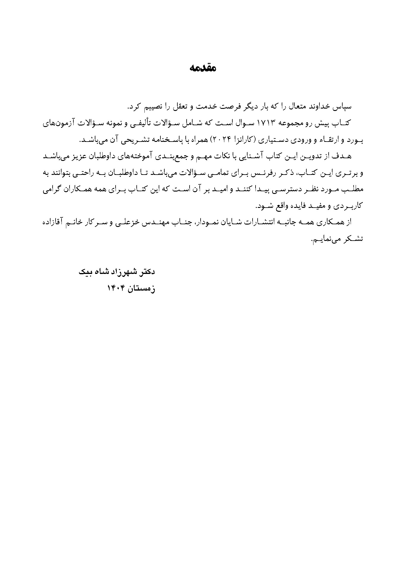 هدف از تدوين اين كتاب، آشنايی با نكات مهم و جمعبندی آموختههای داوطلبان عزيز میباشد و برتری اين كتاب، ذكر رفرنس برای تمامی سؤالات است تا داوطلبان بهراحتی بتوانند به مطلب مورد نظر دسترسی پيدا كنند. اميد بر آن است كه اين كتاب برای همه همكاران گرامی كاربردی و مفيد واقع شود.