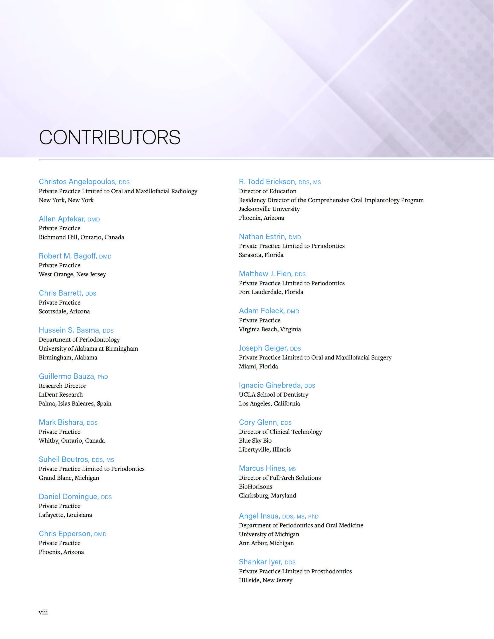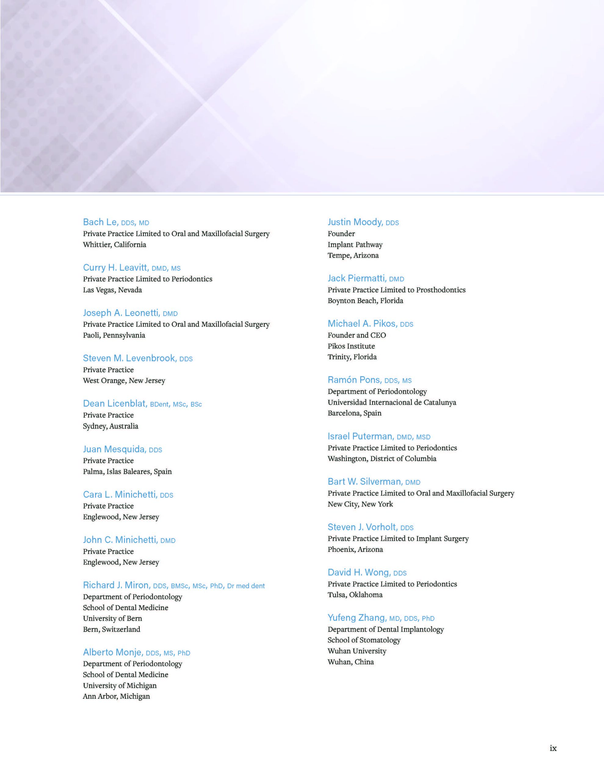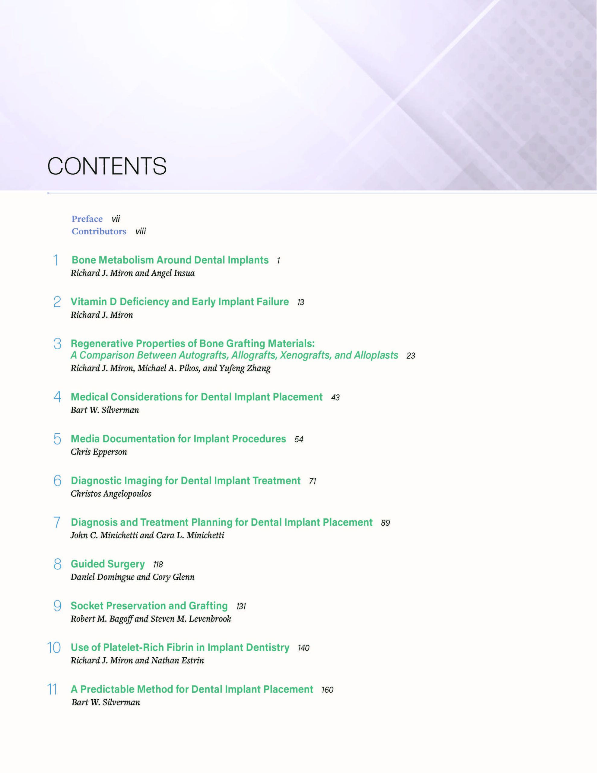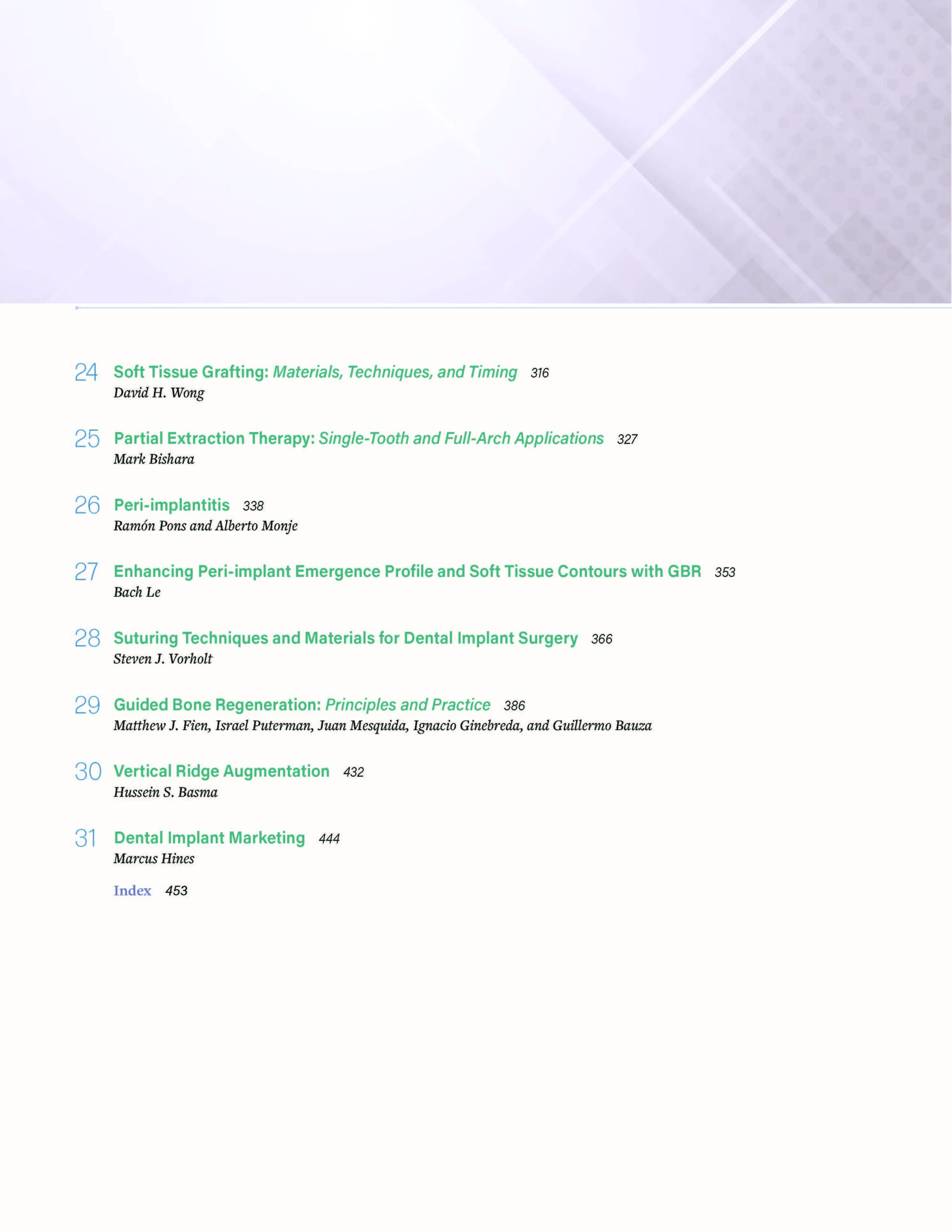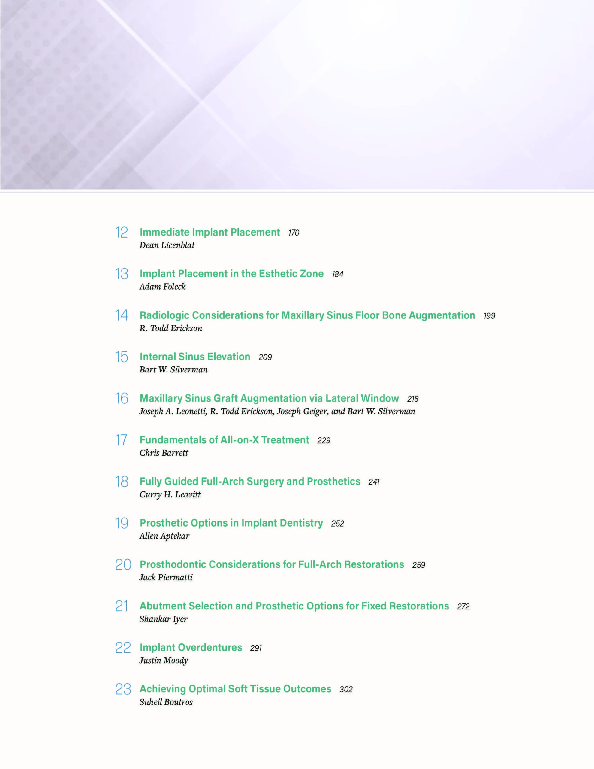This textbook highlights many of these groundbreaking developments, several of which are credited to its contributors—some of the most skilled clinicians in the profession. More than 50 authors from around the world, each with expertise in different subspecialties, have contributed to the book. Early chapters focus on biologic principles, medical considerations, and documentation methods such as photography and CBCT imaging. Subsequent chapters address treatment planning, digital workflows, surgical techniques ranging from single-tooth extraction to guided All-on-X procedures, as well as prosthetic options and related topics such as soft tissue management and peri-implant disease.