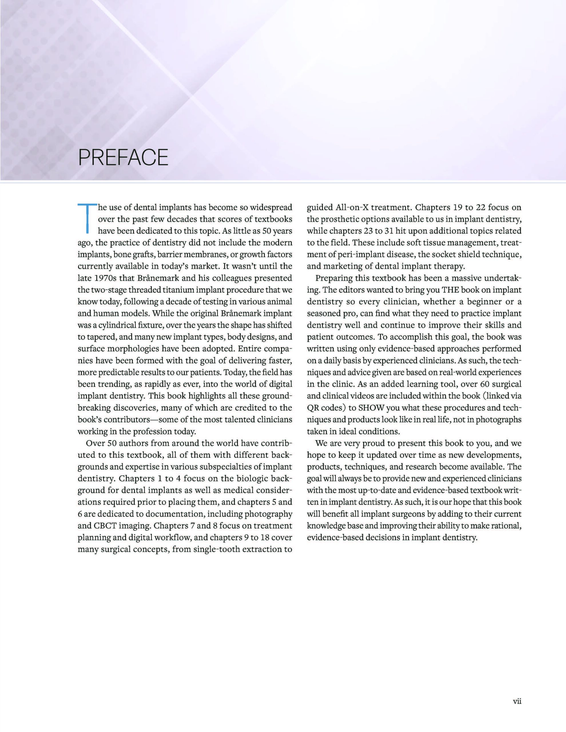 The goal of this book is to serve as a comprehensive, evidence-based reference for both novice and experienced clinicians. All techniques presented are based on real-world clinical experience, and the inclusion of over 60 surgical and clinical videos enhances practical understanding. The editors aim to keep the textbook updated as new research and technologies emerge, ultimately helping clinicians improve decision-making and patient outcomes in implant dentistry.