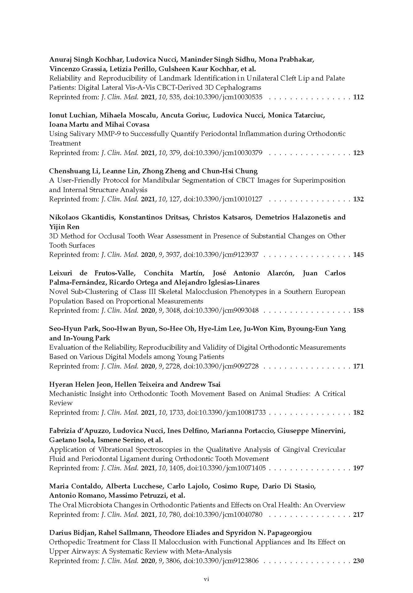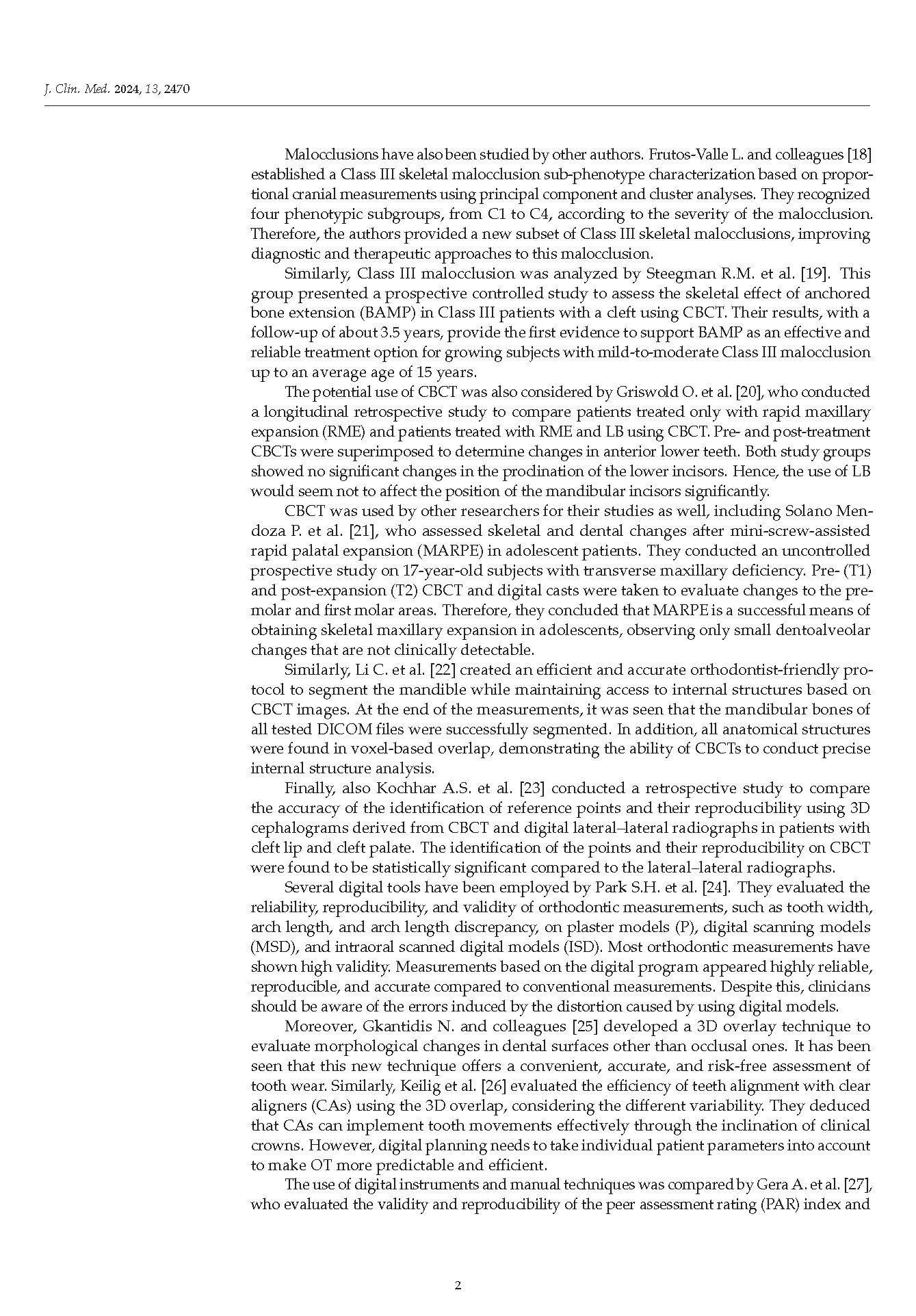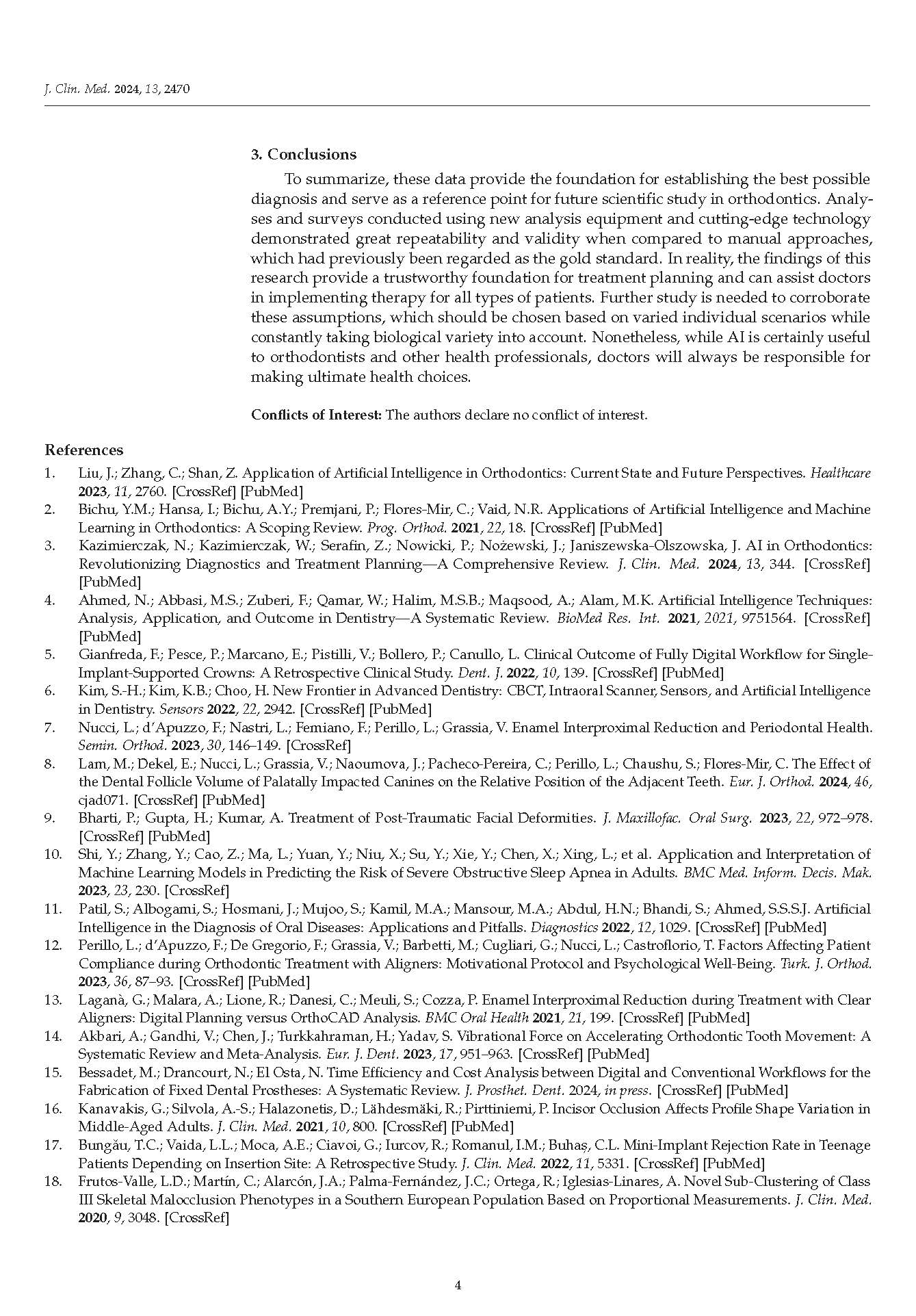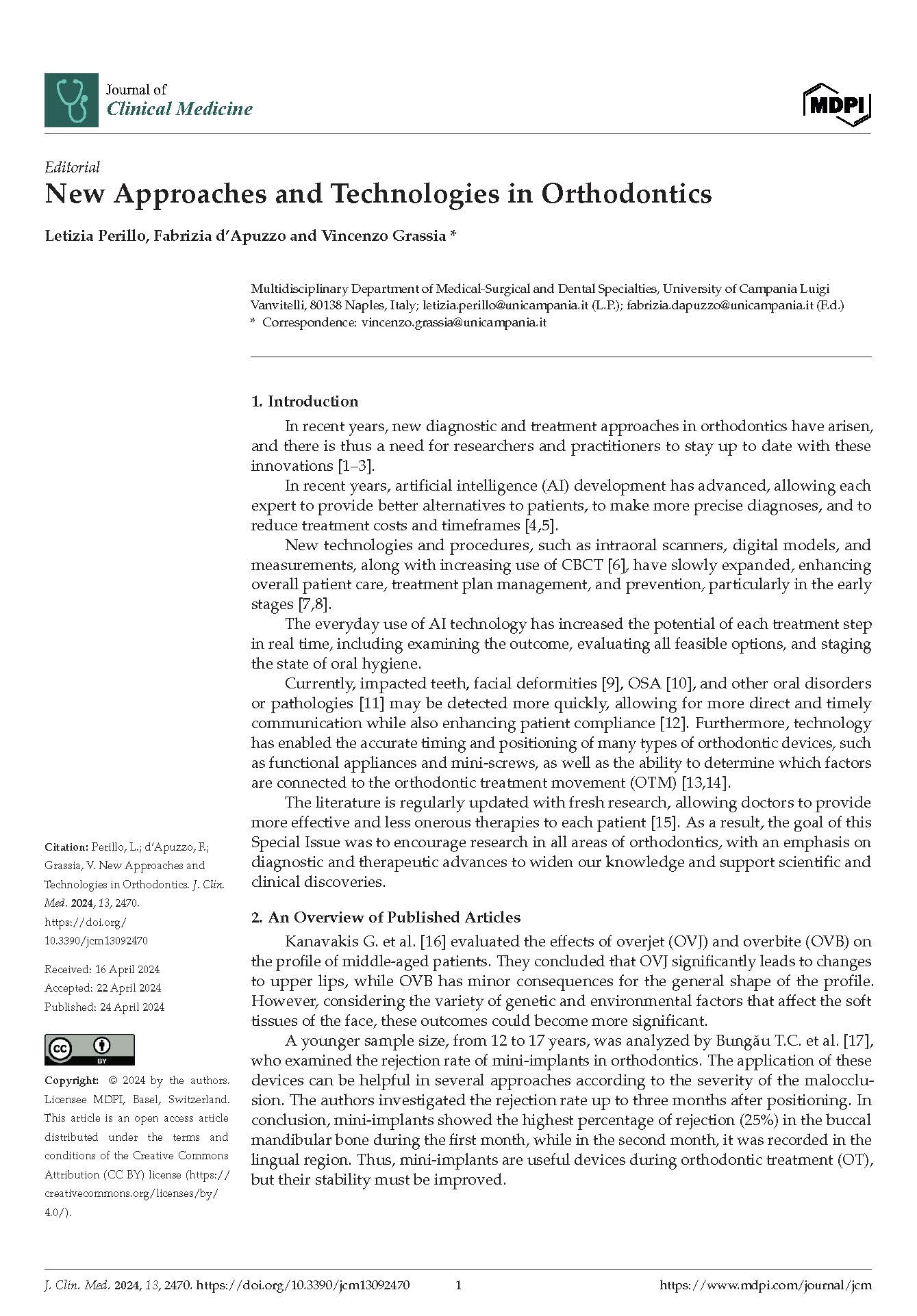 In recent years, new diagnostic and treatment approaches in orthodontics have arisen, and there is thus a need for researchers and practitioners to stay up to date with these innovations [1–3]. In recent years, artificial intelligence (AI) development has advanced, allowing each expert to provide better alternatives to patients, to make more precise diagnoses, and to reduce treatment costs and timeframes New technologies and procedures, such as intraoral scanners, digital models, and measurements, along with increasing use of CBCT , have slowly expanded, enhancing overall patient care, treatment plan management, and prevention, particularly in the early stages . The everyday use of AI technology has increased the potential of each treatment step in real time, including examining the outcome, evaluating all feasible options, and staging the state of oral hygiene. Currently, impacted teeth, facial deformities, OSA , and other oral disorders or pathologies may be detected more quickly, allowing for more direct and timely communication while also enhancing patient compliance . Furthermore, technology has enabled the accurate timing and positioning of many types of orthodontic devices, such as functional appliances and mini-screws, as well as the ability to determine which factors are connected to the orthodontic treatment movement (OTM). The literature is regularly updated with fresh research, allowing doctors to provide more effective and less onerous therapies to each patient .As a result, the goal of this Special Issue was to encourage research in all areas of orthodontics, with an emphasis on diagnostic and therapeutic advances to widen our knowledge and support scientific and clinical discoveries