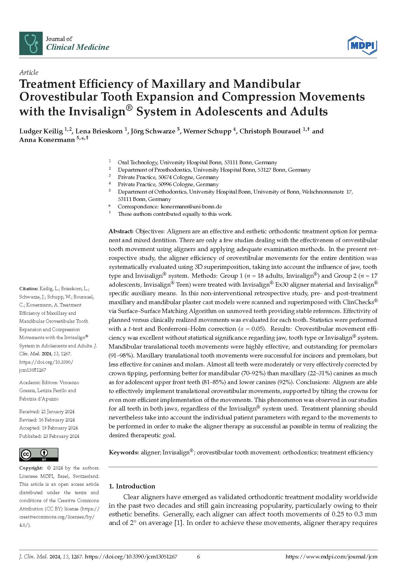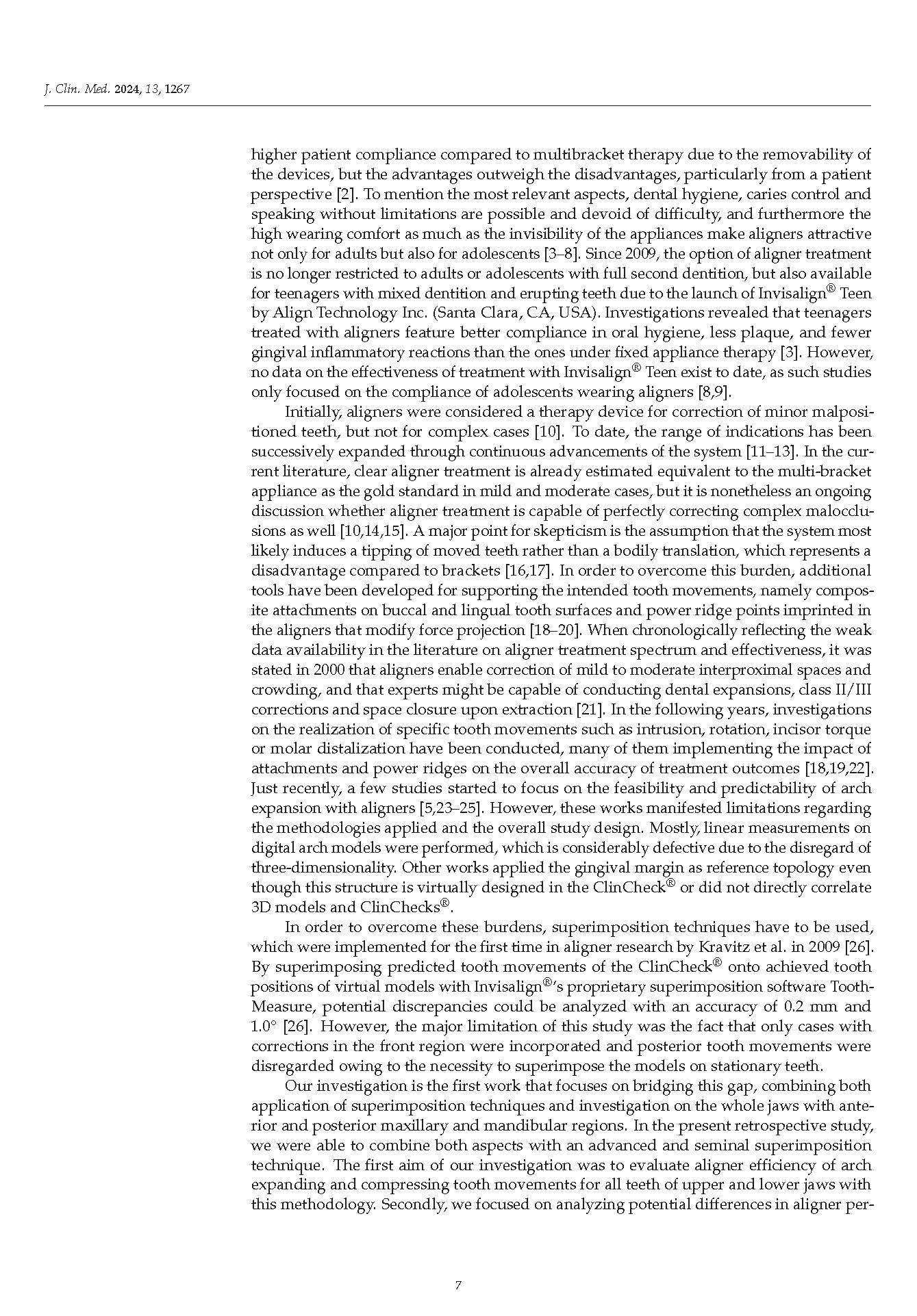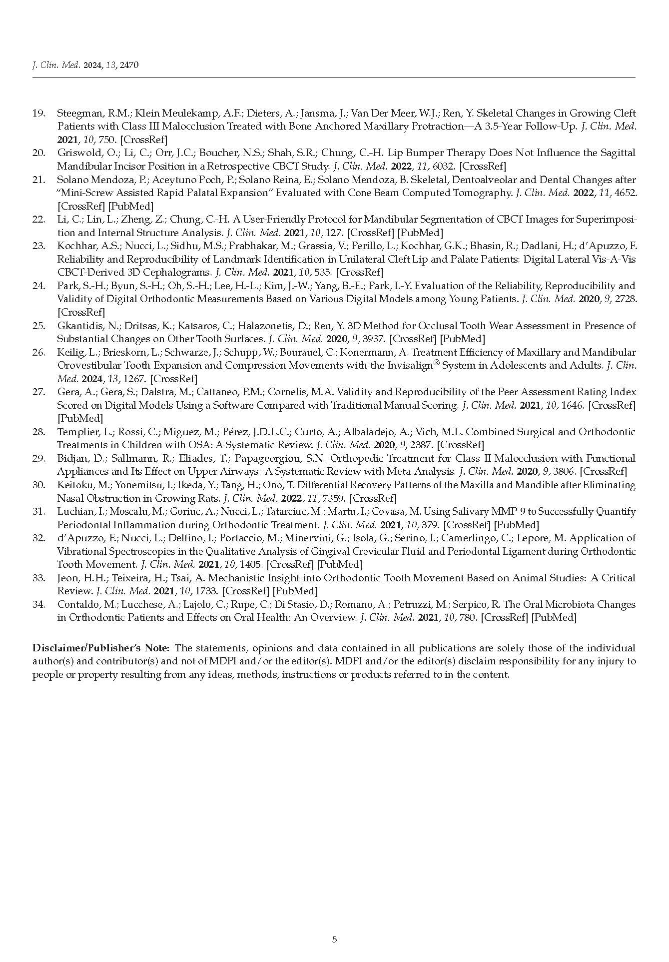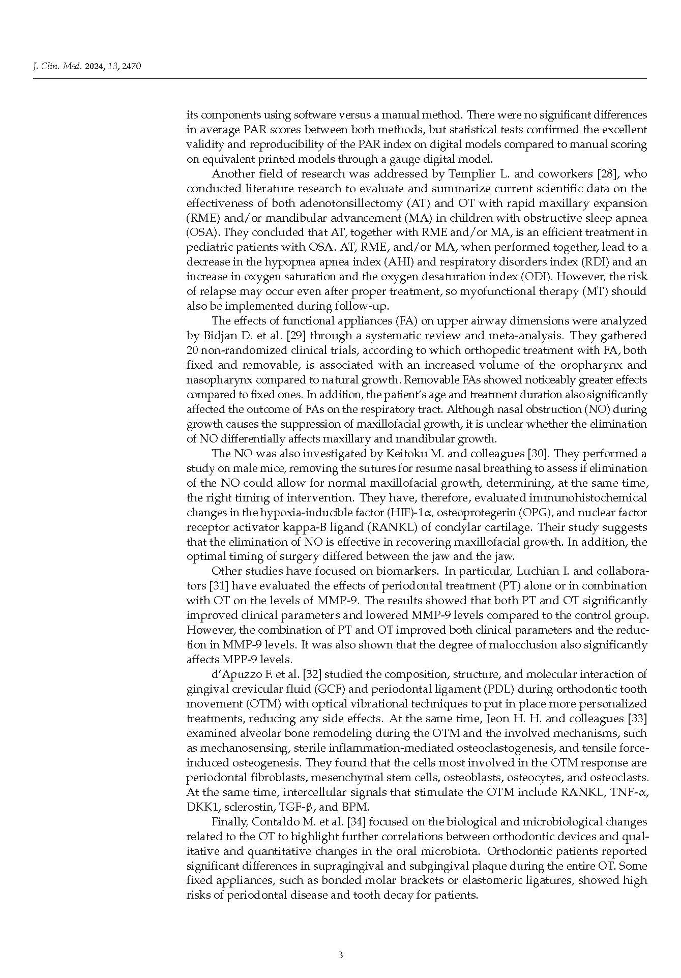In recent years, new diagnostic and treatment approaches in orthodontics have arisen, and there is thus a need for researchers and practitioners to stay up to date with these innovations [1–3]. In recent years, artificial intelligence (AI) development has advanced, allowing each expert to provide better alternatives to patients, to make more precise diagnoses, and to reduce treatment costs and timeframes New technologies and procedures, such as intraoral scanners, digital models, and measurements, along with increasing use of CBCT , have slowly expanded, enhancing overall patient care, treatment plan management, and prevention, particularly in the early stages . The everyday use of AI technology has increased the potential of each treatment step in real time, including examining the outcome, evaluating all feasible options, and staging the state of oral hygiene. Currently, impacted teeth, facial deformities, OSA , and other oral disorders or pathologies may be detected more quickly, allowing for more direct and timely communication while also enhancing patient compliance . Furthermore, technology has enabled the accurate timing and positioning of many types of orthodontic devices, such as functional appliances and mini-screws, as well as the ability to determine which factors are connected to the orthodontic treatment movement (OTM). The literature is regularly updated with fresh research, allowing doctors to provide more effective and less onerous therapies to each patient .As a result, the goal of this Special Issue was to encourage research in all areas of orthodontics, with an emphasis on diagnostic and therapeutic advances to widen our knowledge and support scientific and clinical discoveries