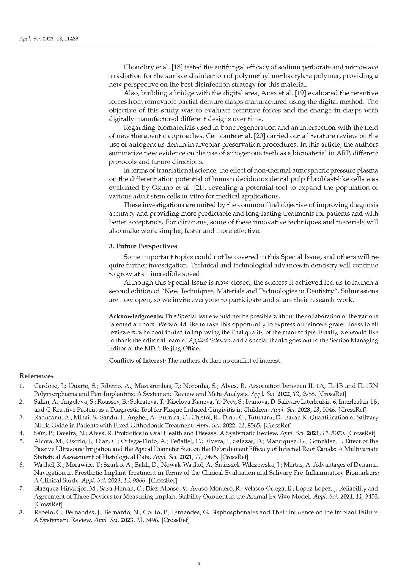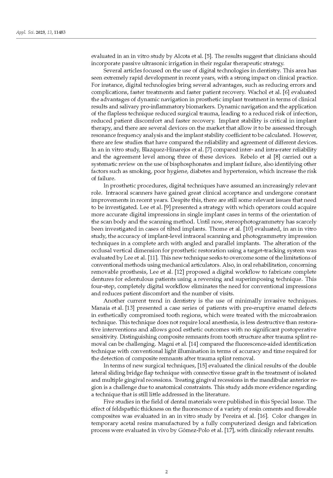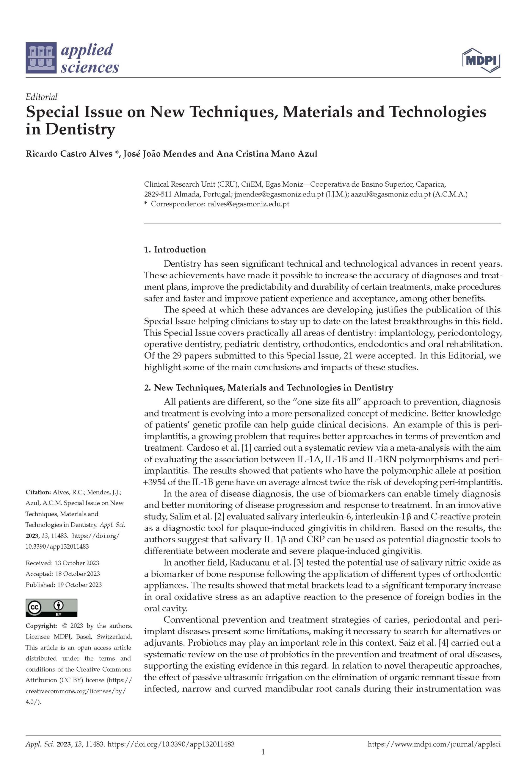 Dentistry has seen significant technical and technological advances in recent years. These achievements have made it possible to increase the accuracy of diagnoses and treatment plans, improve the predictability and durability of certain treatments, make procedures safer and faster and improve patient experience and acceptance, among other benefits. The speed at which these advances are developing justifies the publication of this Special Issue helping clinicians to stay up to date on the latest breakthroughs in this field. This Special Issue covers practically all areas of dentistry: implantology, periodontology, operative dentistry, pediatric dentistry, orthodontics, endodontics and oral rehabilitation. Of the 29 papers submitted to this Special Issue, 21 were accepted. In this Editorial, we highlight some of the main conclusions and impacts of these studies.