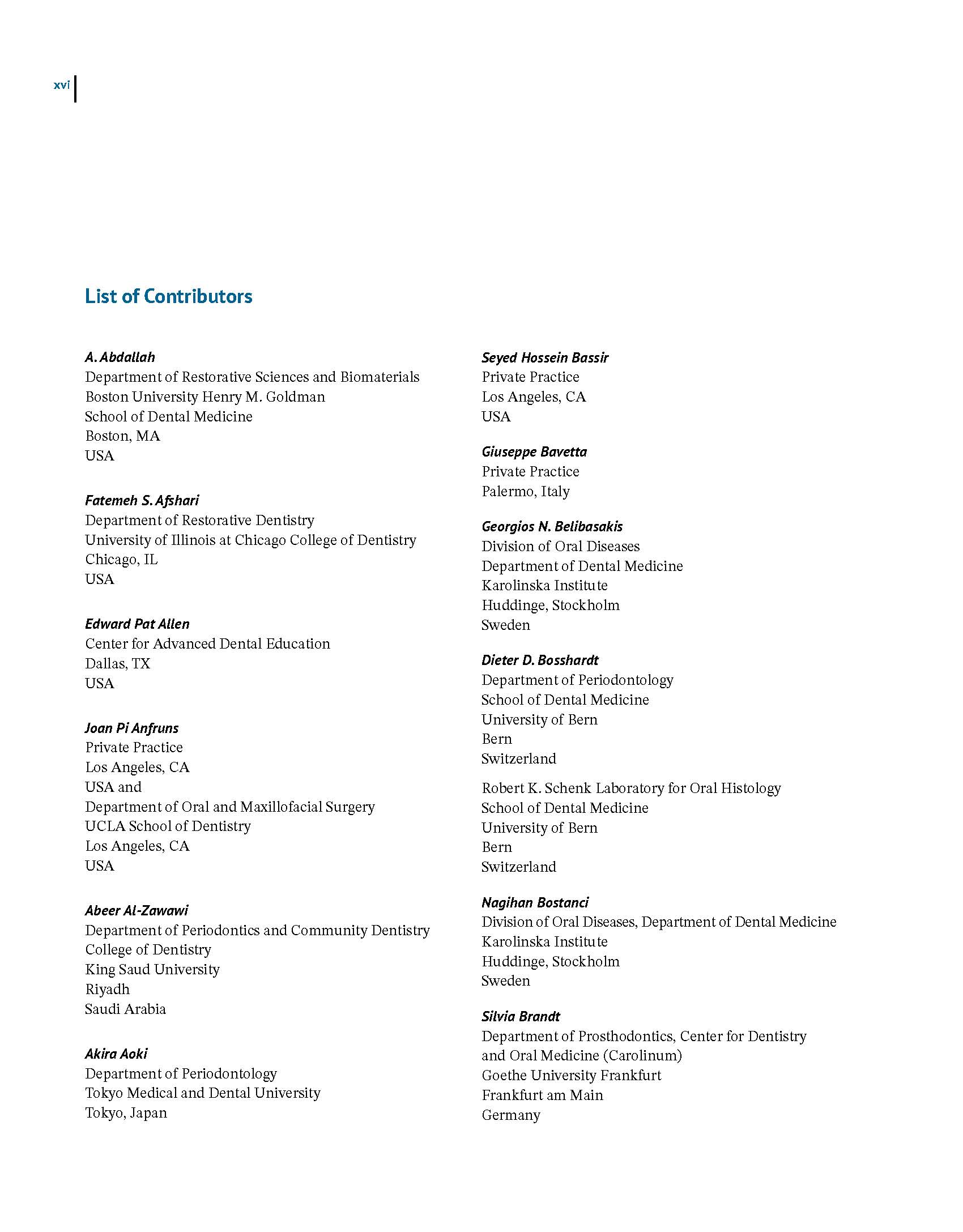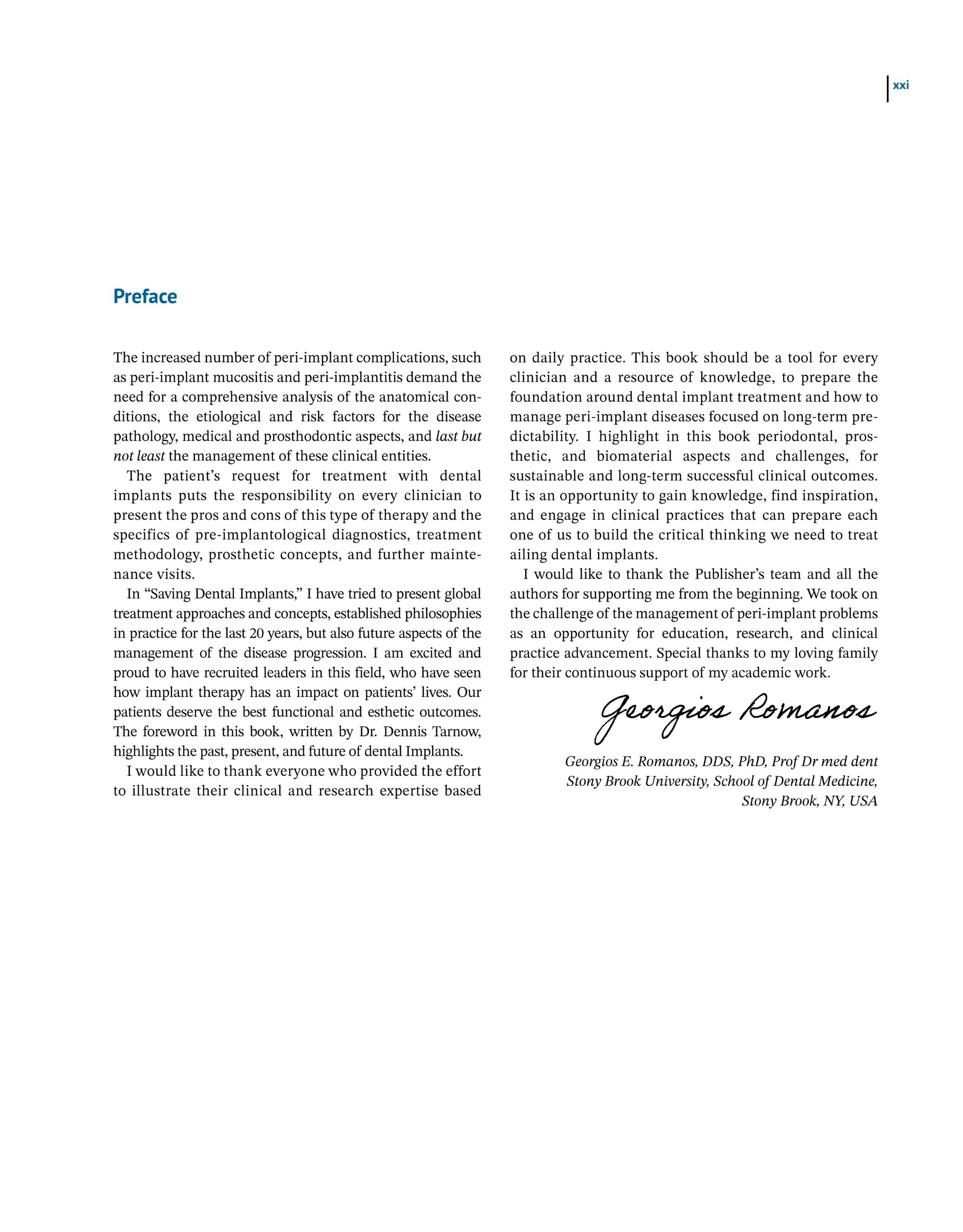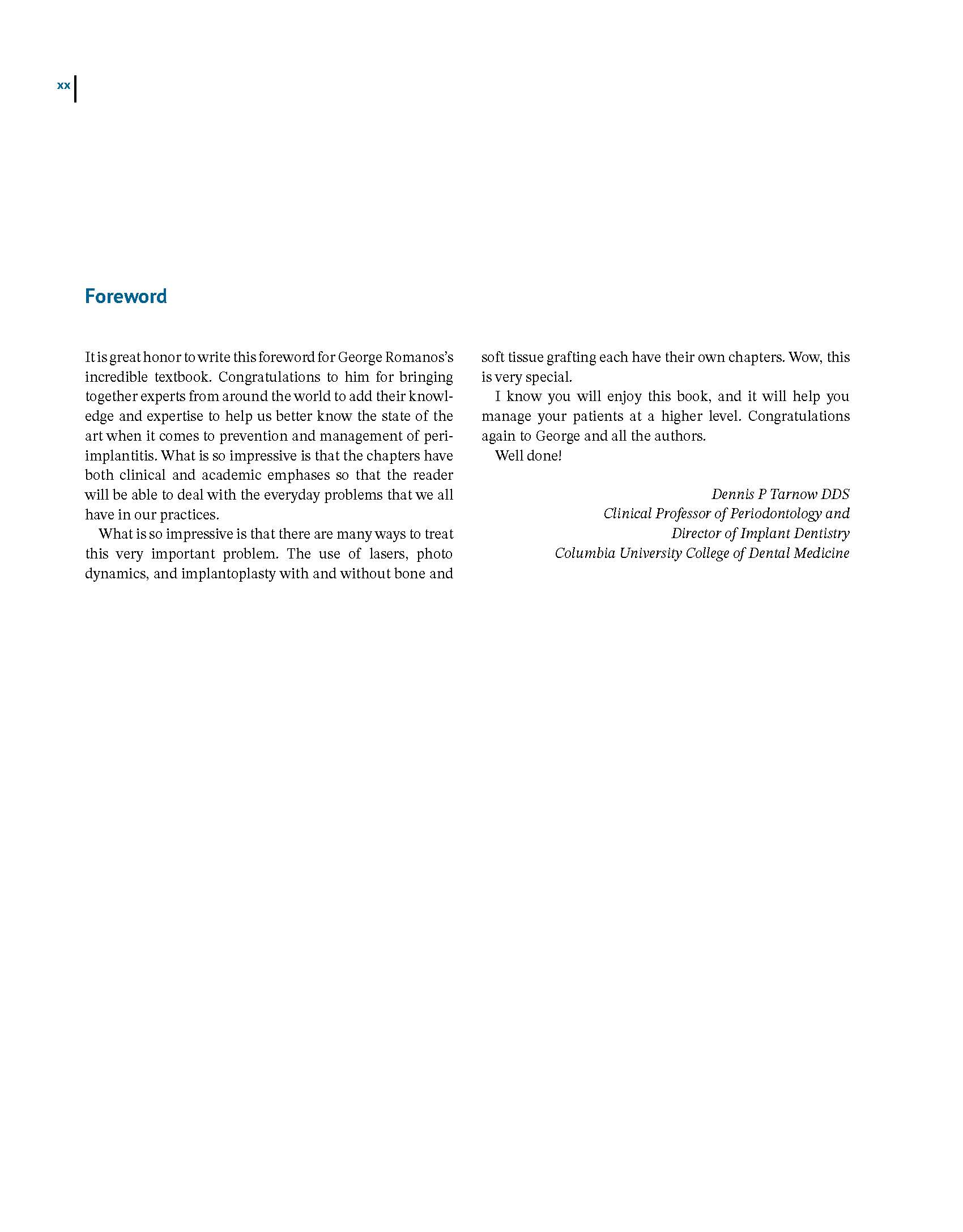 Saving Dental Implants presents established and emerging treatment concepts for the prevention and management of peri-implant complications, drawing on over two decades of clinical experience and expert contributions. The book emphasizes periodontal, prosthetic, and biomaterial considerations essential for achieving predictable, long-term functional and esthetic outcomes.