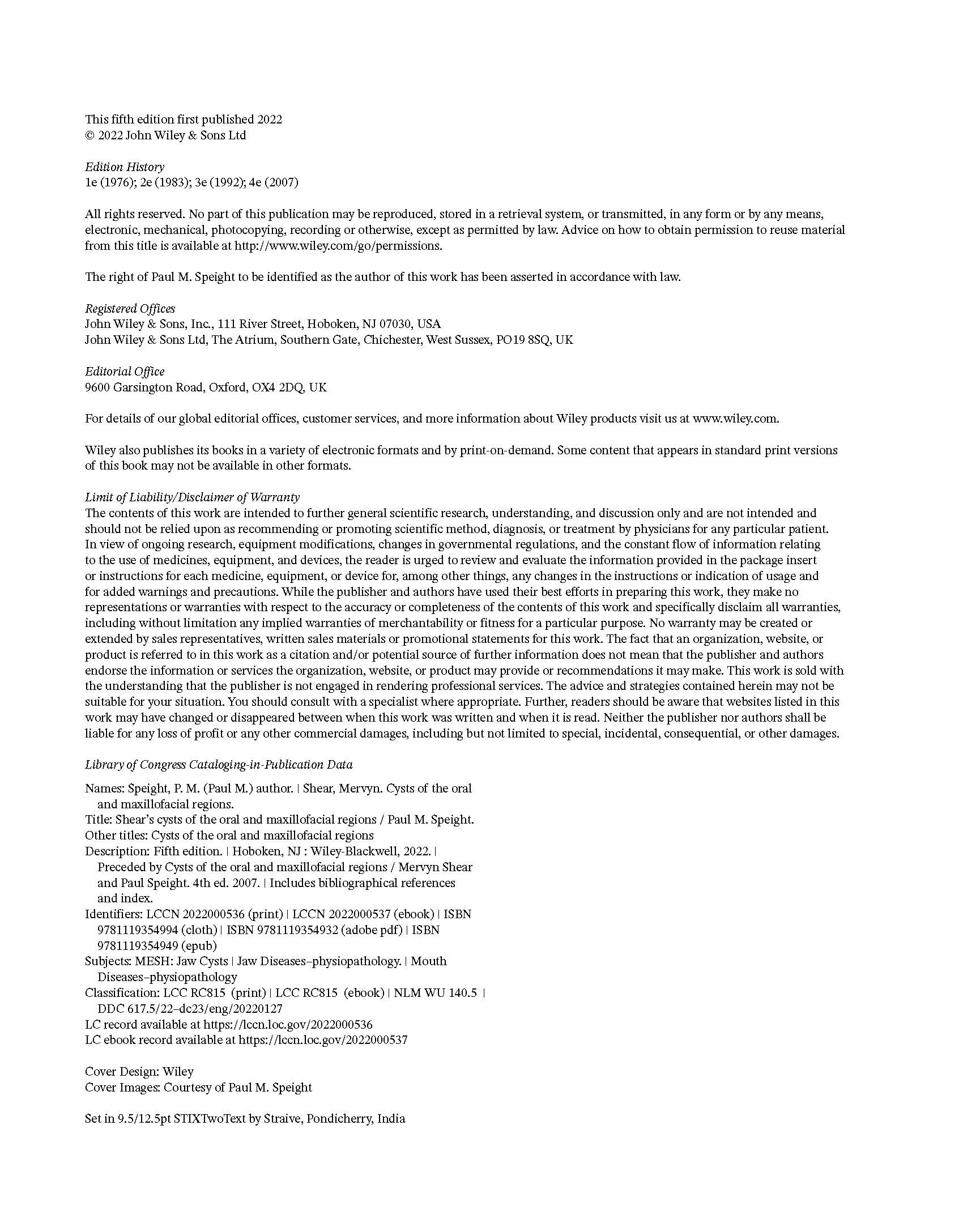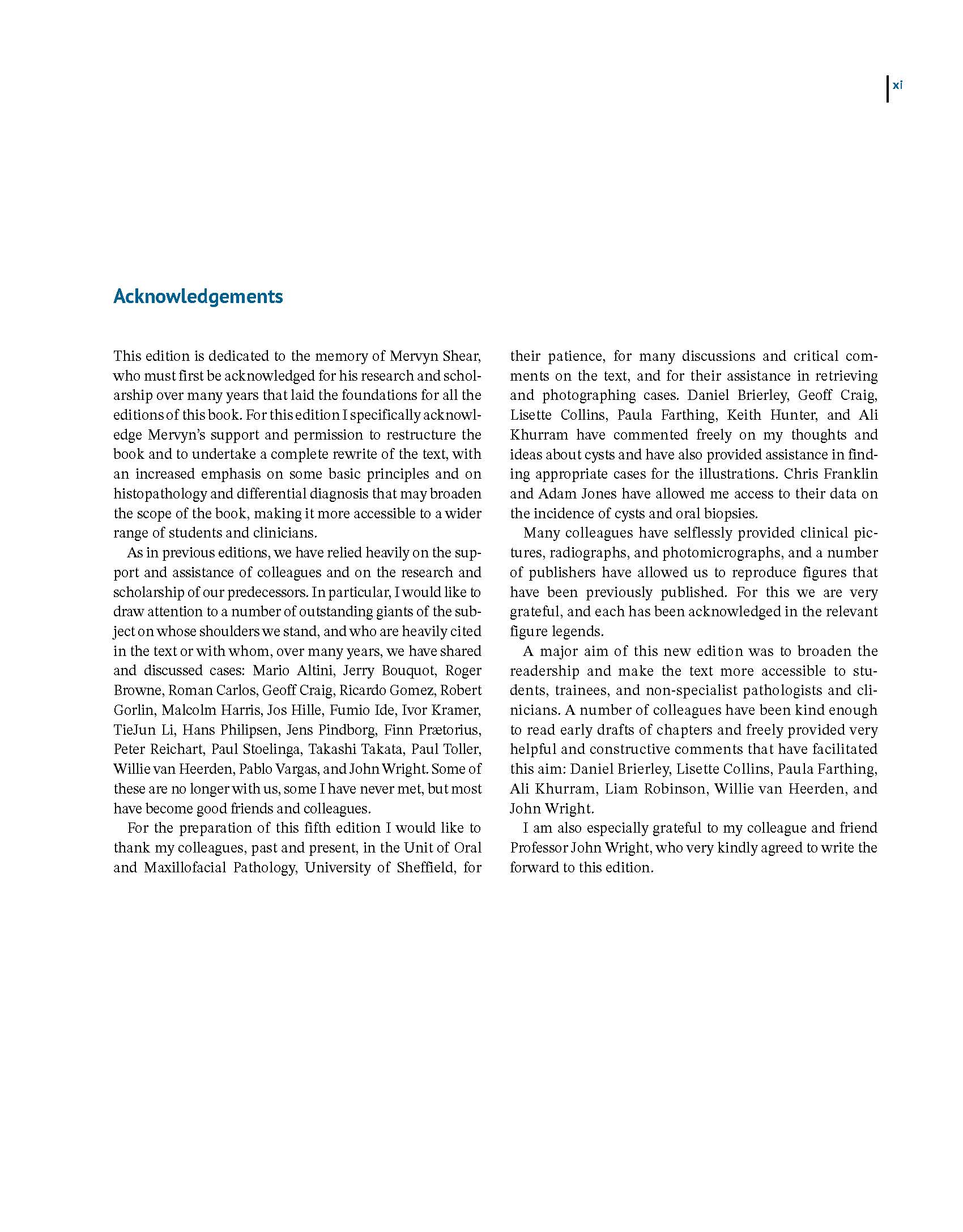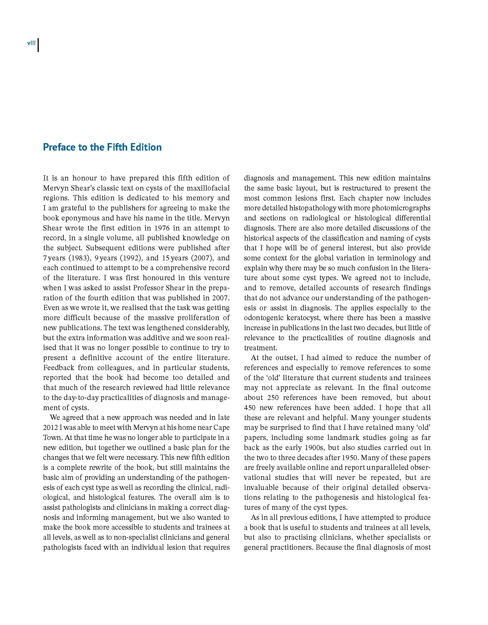 In 2012, the editor and Professor Shear agreed that a new approach was necessary. Although Professor Shear was no longer able to participate actively, they jointly outlined the changes needed for a new edition. As a result, the fifth edition is a complete rewrite that retains the core goal of explaining cyst pathogenesis while focusing more clearly on clinical, radiological, and histological features relevant to diagnosis and management.