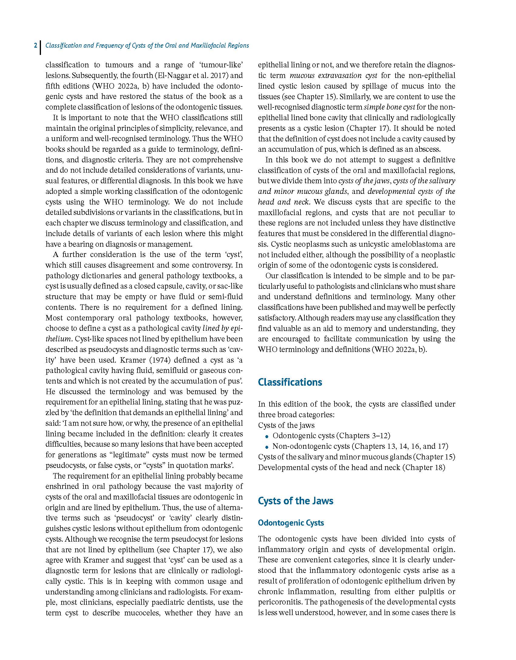 The book has been restructured to improve accessibility, presenting common lesions first and expanding sections on histopathology, differential diagnosis, and radiological features. Additional emphasis is placed on the historical development and classification of cysts to explain variations in terminology and confusion within the literature. Research findings that do not contribute meaningfully to diagnosis or understanding of pathogenesis—particularly in relation to odontogenic keratocysts—have been removed.